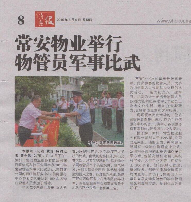 在2015年八一建軍節(jié)即將來臨之際,公司上下歡聚在百旺信高科技工業(yè)園,舉辦軍事隊列比武,一方面慶祝中國人民解放軍建軍88周年,另一方面向大家宣傳強(qiáng)身健體的觀念,同時向各位業(yè)主展示公司秩序維護(hù)隊伍的專業(yè)性和可靠性。每個服務(wù)中心代表隊都意氣風(fēng)發(fā)、斗志昂揚(yáng),充分展示了自己的實(shí)力,收獲了屬于自己的榮譽(yù)。