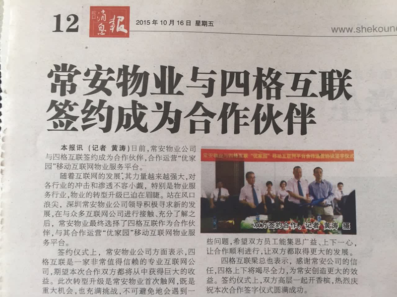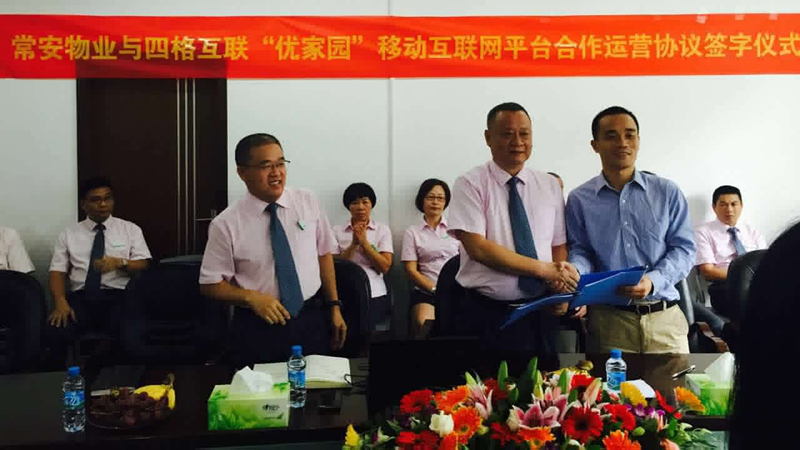 2015年10月10日上午于公司會議室與四格互聯進行了合作簽字儀式。儀式上,張武董事長表示,四格互聯是一家非常值得信賴的專業(yè)互聯網公司,本次合作雙方都將從合作中獲得巨大的收益。公司由于是首次進行此類轉型,將不可避免地遇到各種困難,希望雙方員工能集思廣益、上下一心,讓合作順利進行,讓雙方都取得更大的發(fā)展。四格互聯的梁總表示,感謝常安公司的信任,物業(yè)方面常安是專家,希望得到常安更多的指導,四格上下將竭盡全力,為常安創(chuàng)造更大的效益。張總和梁總簽字之后一起開香檳,熱烈慶祝本次合作簽字儀式的圓滿成功。