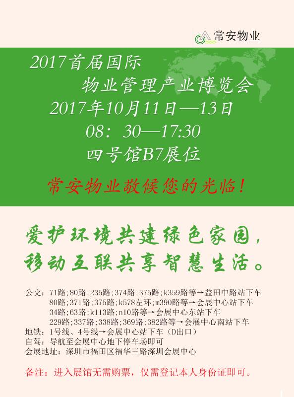 2017首屆國際物業(yè)管理產(chǎn)業(yè)博覽會于今日在深圳市會展中心舉辦,常安物業(yè)在此敬候您的光臨?。?!