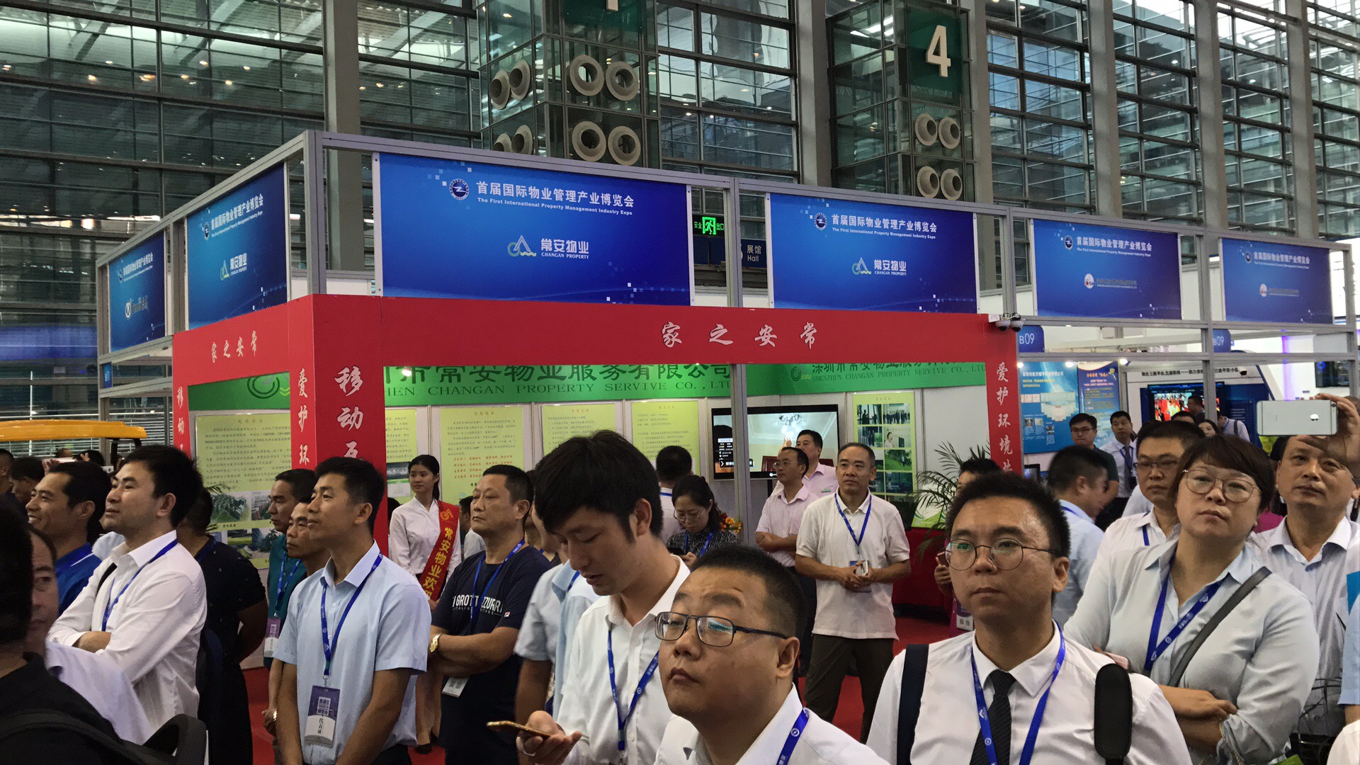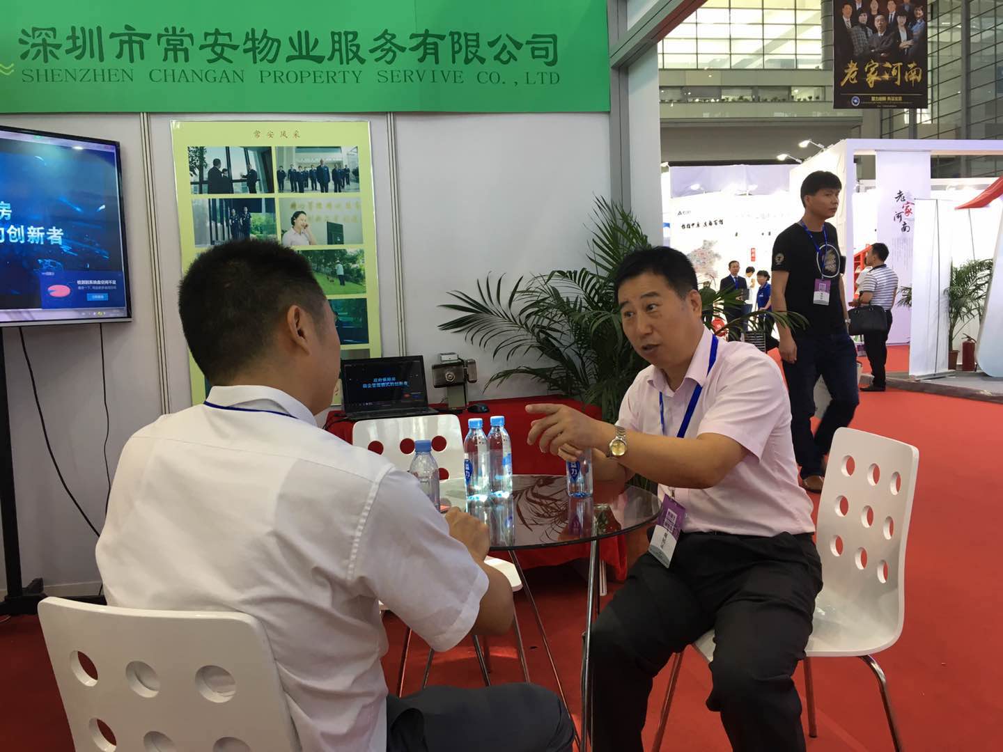 中國(guó)物業(yè)管理協(xié)會(huì)會(huì)長(zhǎng)沈建忠及深圳市物業(yè)管理協(xié)會(huì)會(huì)長(zhǎng)曹陽(yáng)在常安物業(yè)公司展位前合影留戀