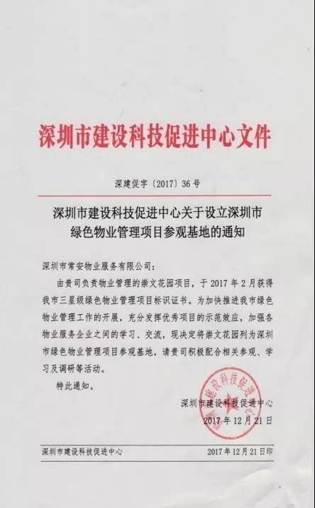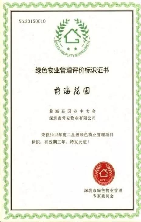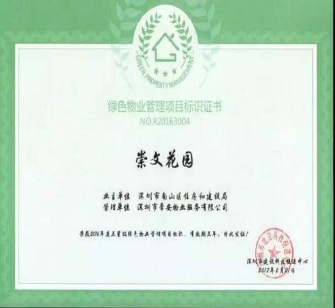 依據(jù)2011 年深圳出臺的首部《深圳市綠色物業(yè)管理導(dǎo)則(試行)》和 2013 年出臺的《深圳市綠色物業(yè)管理項目評價辦法和細(xì)則(試行)》,常安物業(yè)積極響應(yīng)并開展綠色物業(yè)管理工作,2016 年至今,共有四個項目榮獲了深圳市政府部門頒發(fā)的綠色物業(yè)管理項目證書,其中崇文花園還被深圳市政府部門列為深圳市綠色物業(yè)管理項目參觀基地,2019年出任廣東省綠色供應(yīng)鏈協(xié)會綠色物業(yè)管理專業(yè)委員會副主任委員單位。色物業(yè)管理